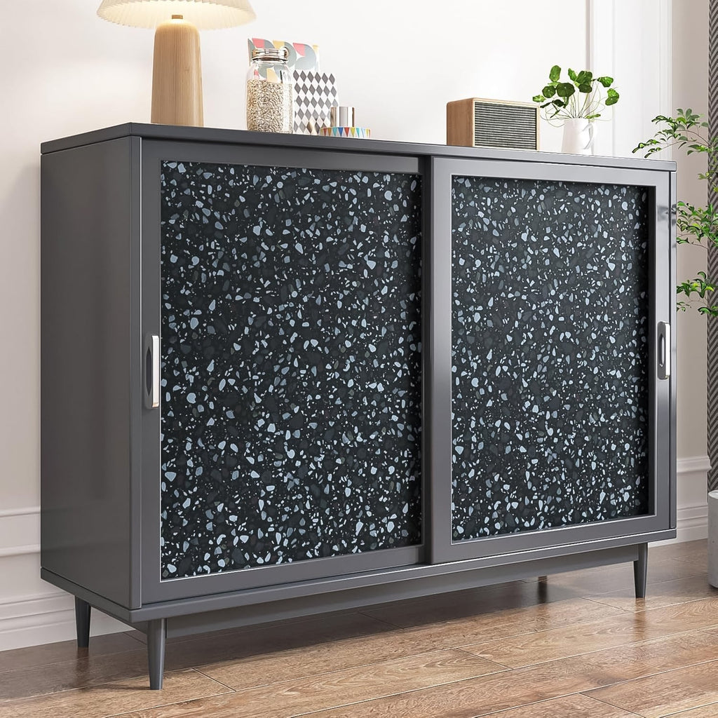 • Pattern: Terrazzo with black, grey, and blue tones